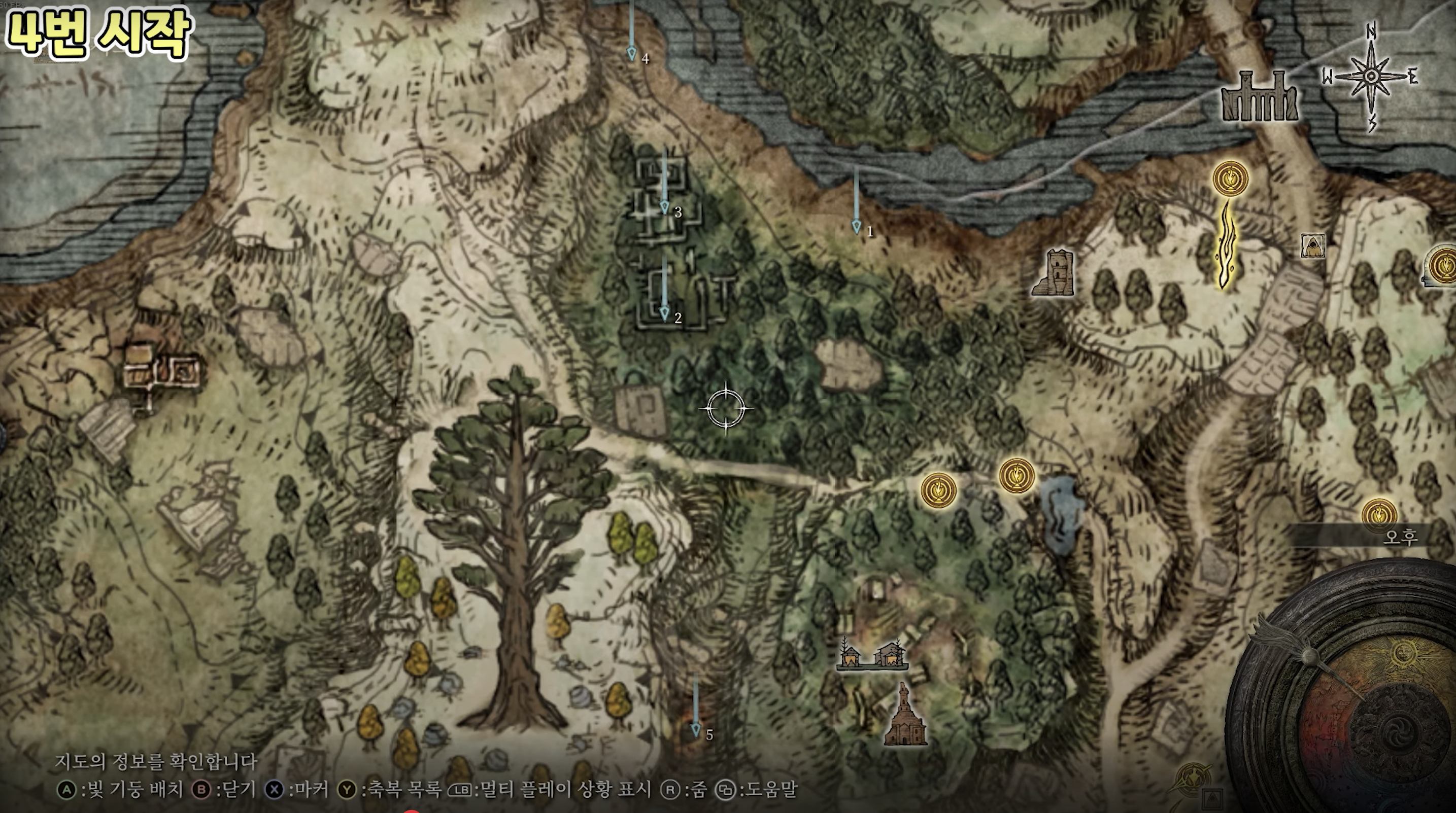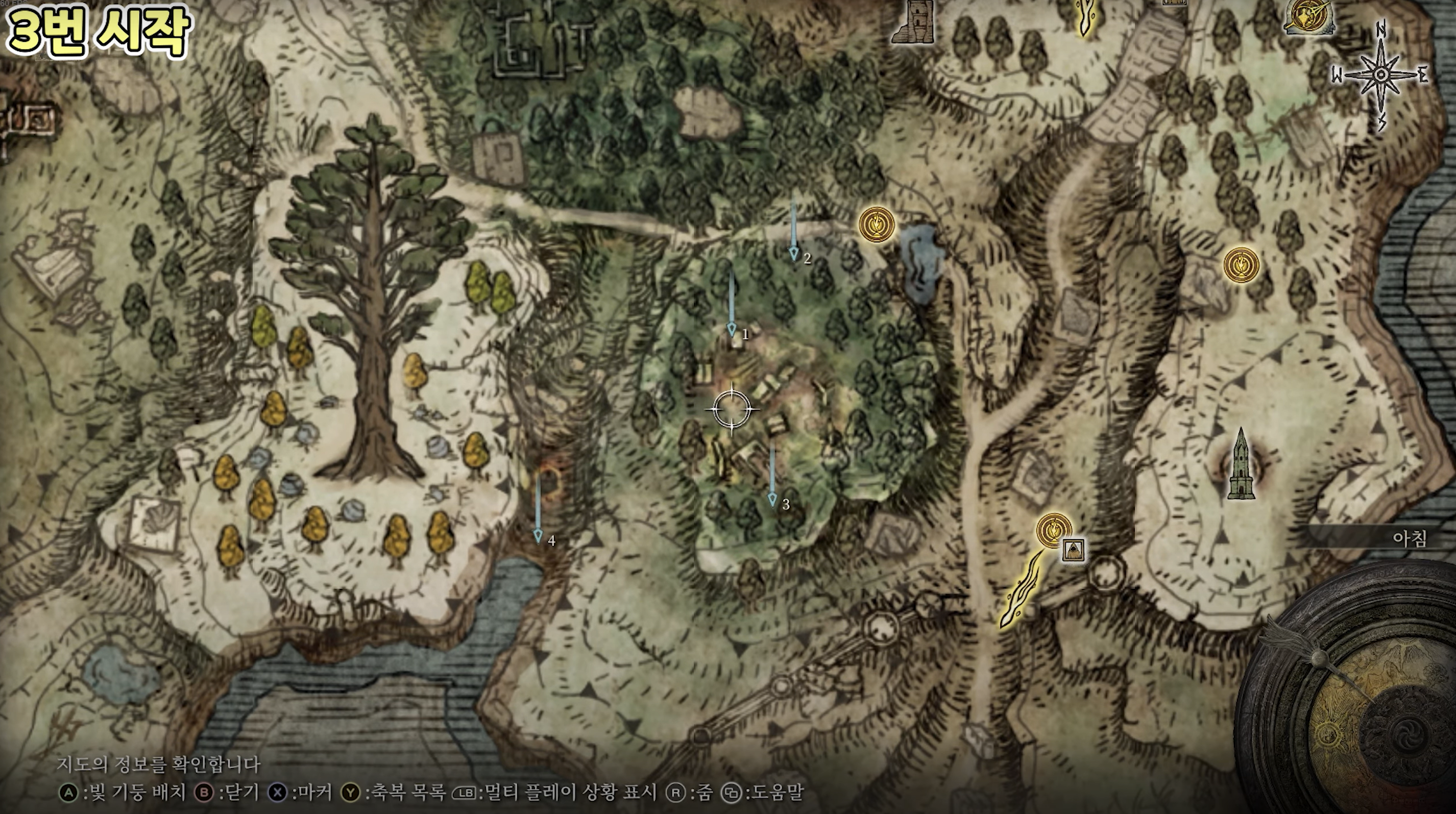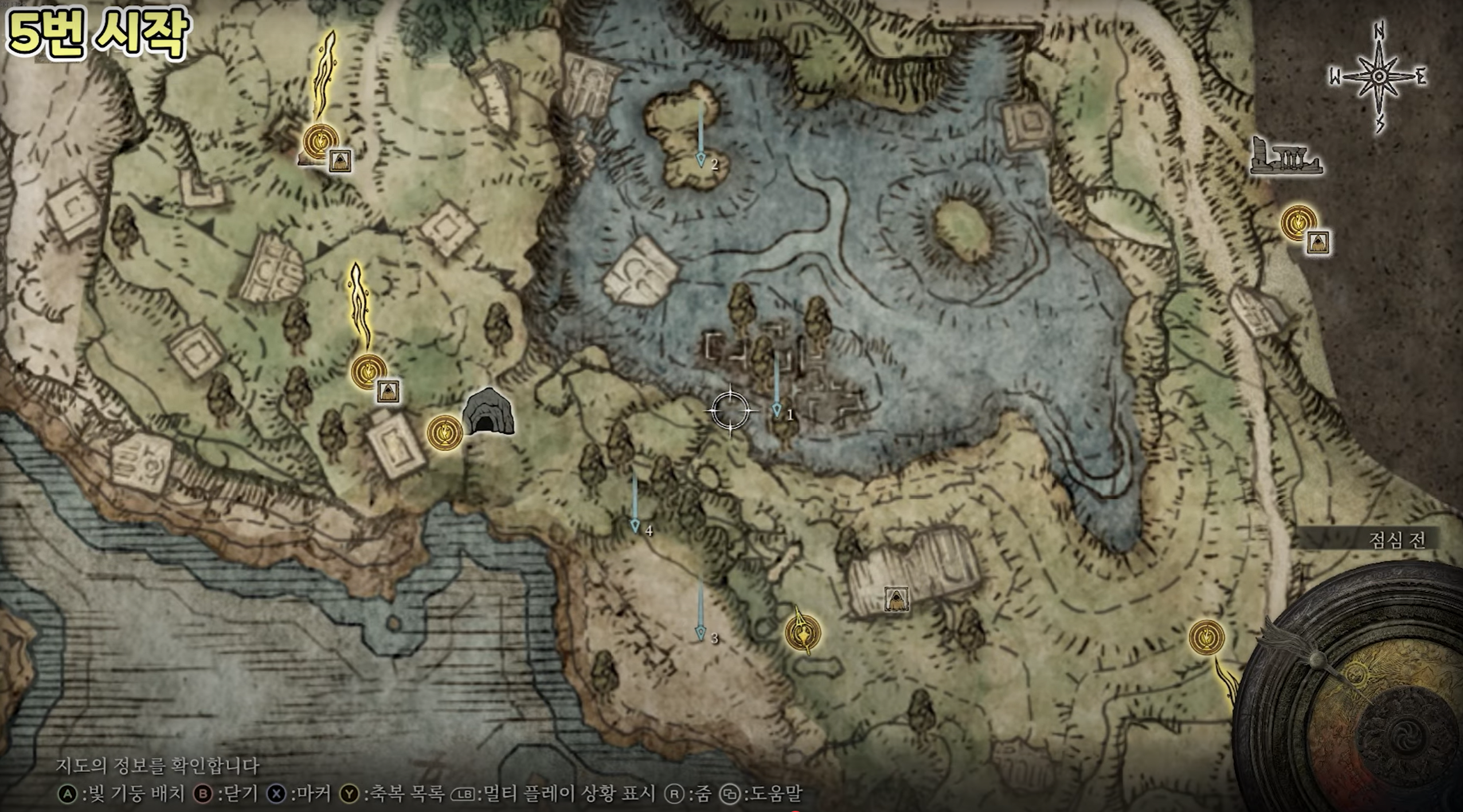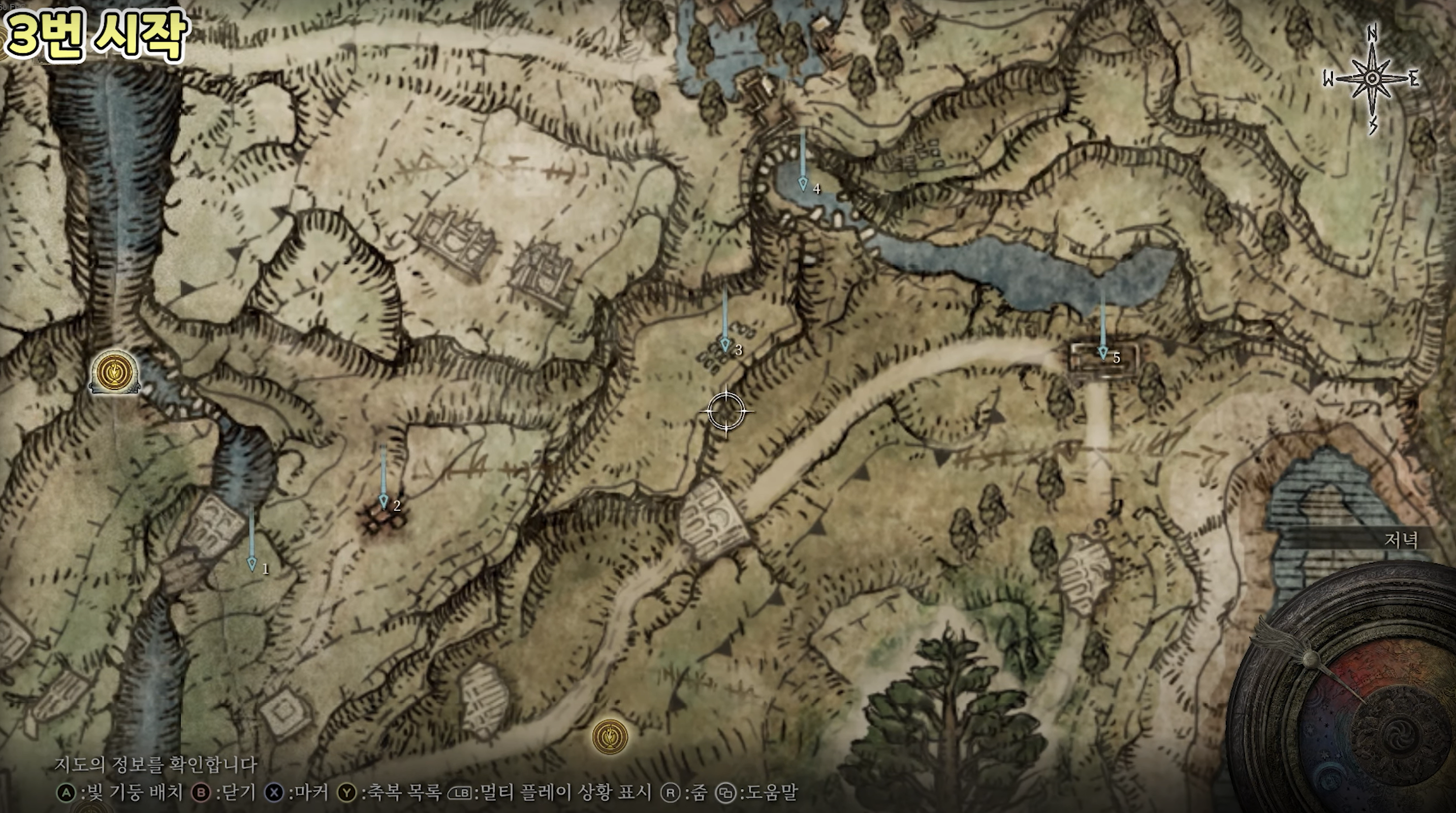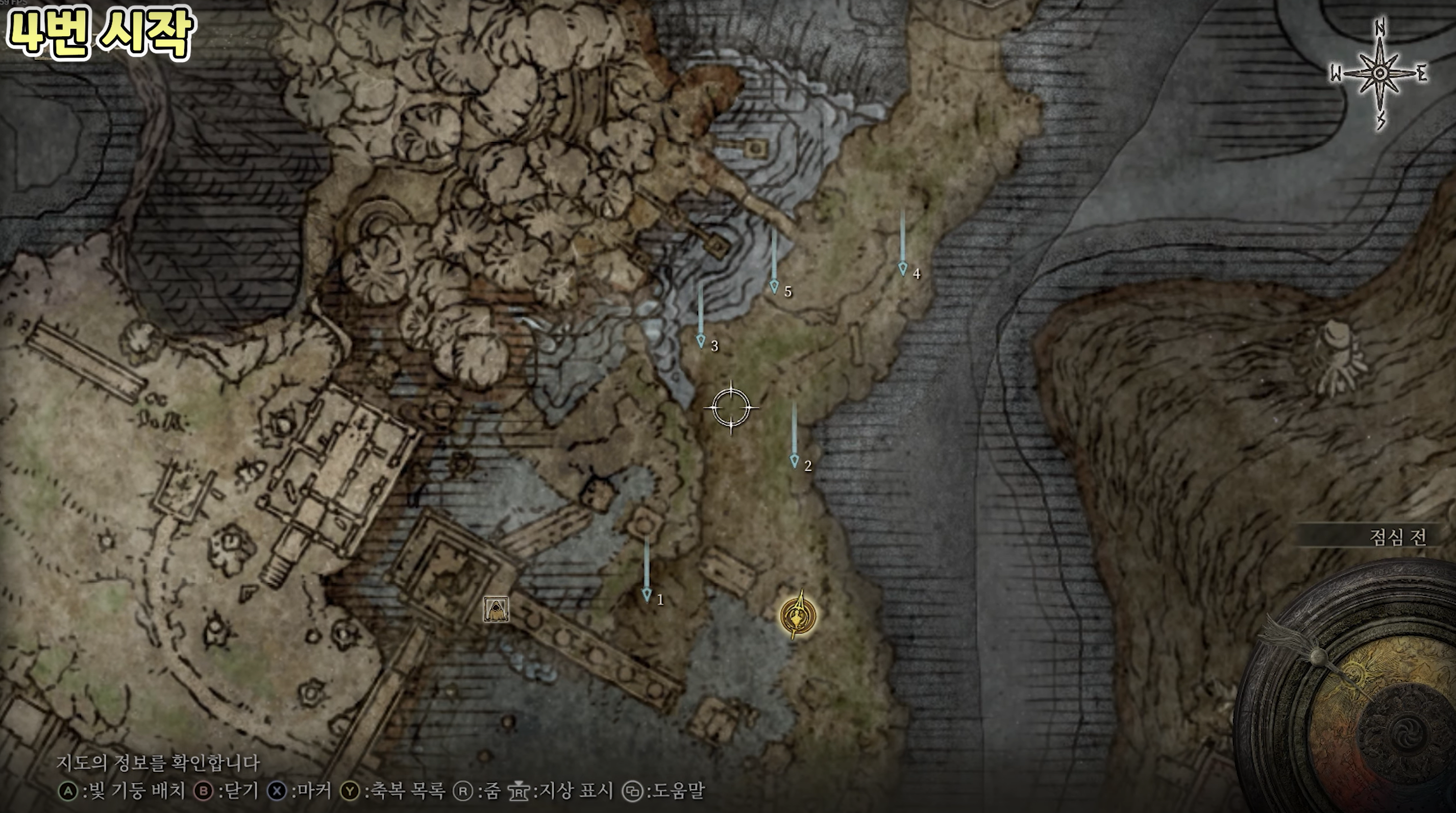 4번: 나무 타고 오른쪽 타고 동굴로 들어감 - 큰 개미에게서 '희인의 룬' 획득 - 색 잃은 단석[6] - 엘데의 유성