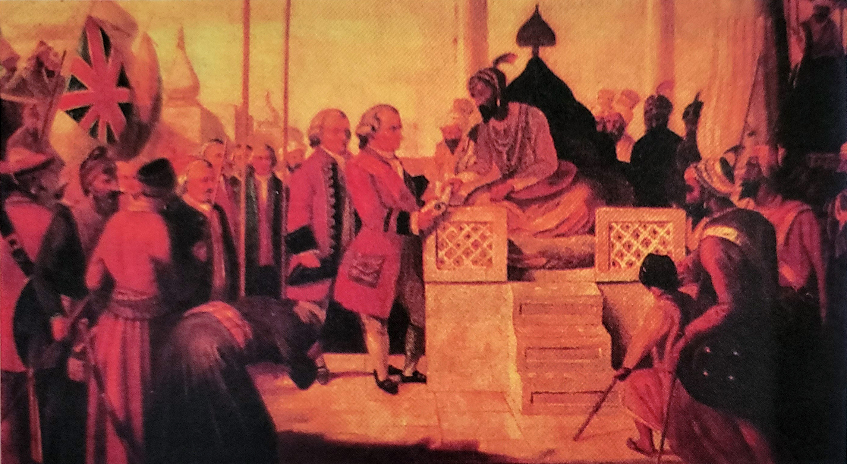 ▲ 인도의 최대 주주 플라시 전투에서 프랑스를 무찌른 뒤 동인도회사의 서기 클라이브가 무굴 황제에게서 징세권과 재정권을 상징하는 디와니를 받고 있다. 이로써 영국은 일개 기업을 통해 인도를 식민지로 지배하게 되었다.