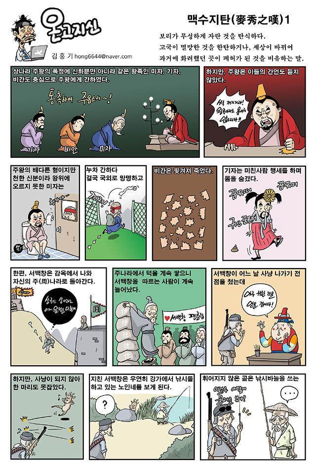 기자(箕子)는 이름이 서여(胥余)로, 주(紂)의 아저씨다. 주(紂)를 간했으나 듣지 않자, 거짓으로 미친 척하다가 노예(奴隸)의 신분으로 전락해서 숨어 지냈다. 주나라 무왕은 주(紂)를 정벌한 후 기자에게 천하를 다스릴 방책을 물었는데, 이때 기자는 홍범(洪範)을 진언했다고 한다. ‘사기’에는 기자가 조선(朝鮮)에 봉해졌다고 되어 있다. 위지노(爲之奴)는 주(紂)의 노예가 되었다는 말이다.