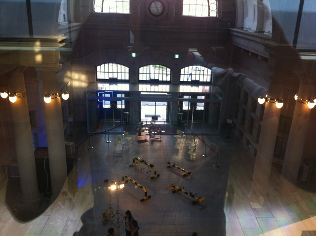 2층에서 내려다본 전시장 출입구와 1층 전시물의 모습.