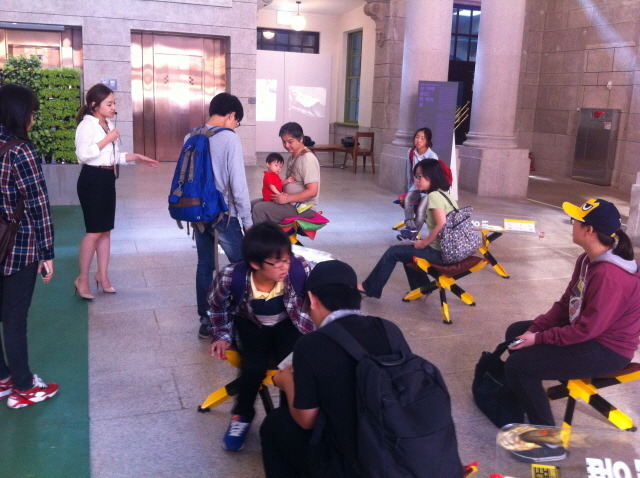 바리케이트는 공공의 공간을 사적으로 점유할 수 있게 만들어주는 도구입니다. 그 사적 공간에 앉은 합정동팀.