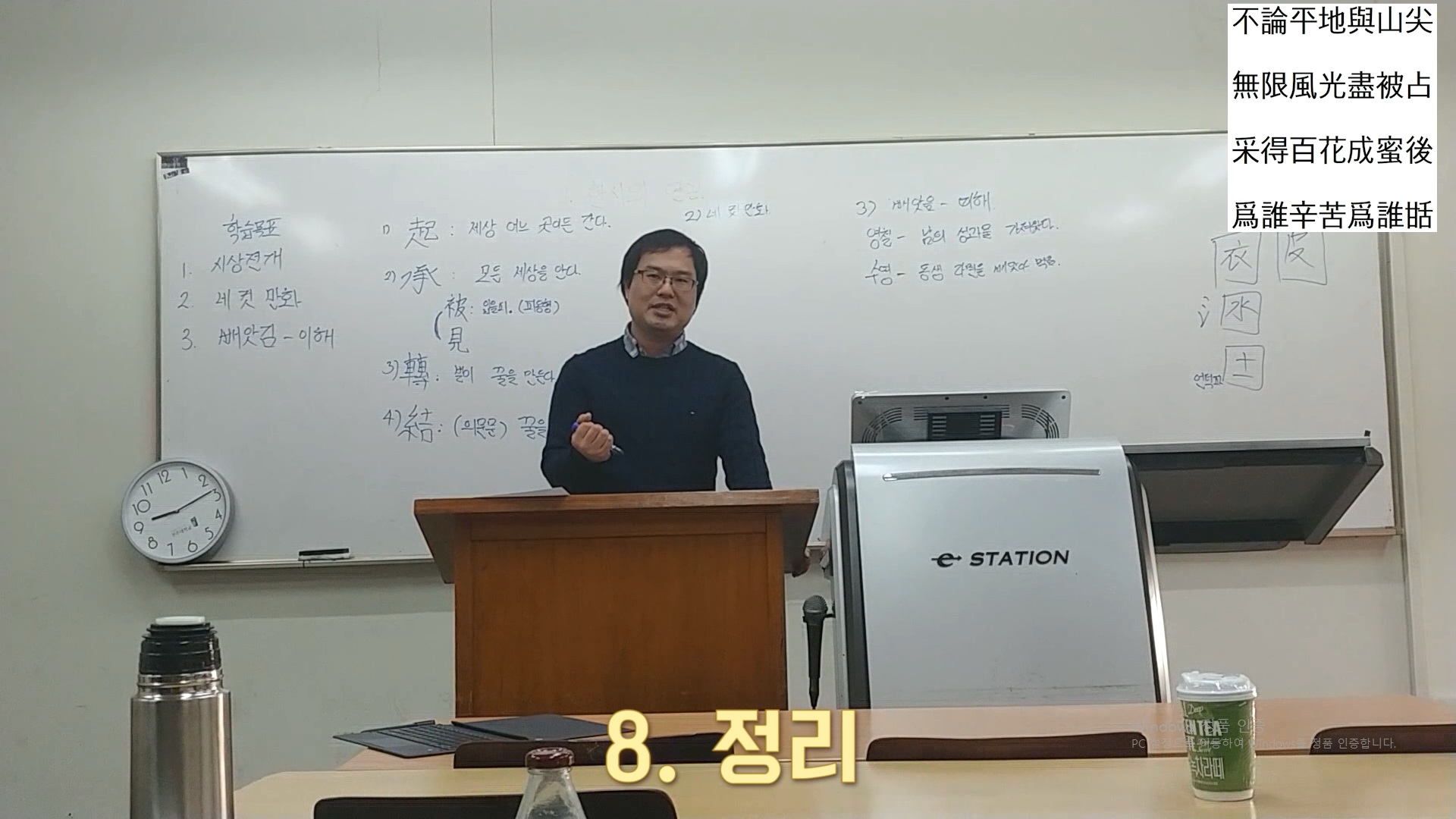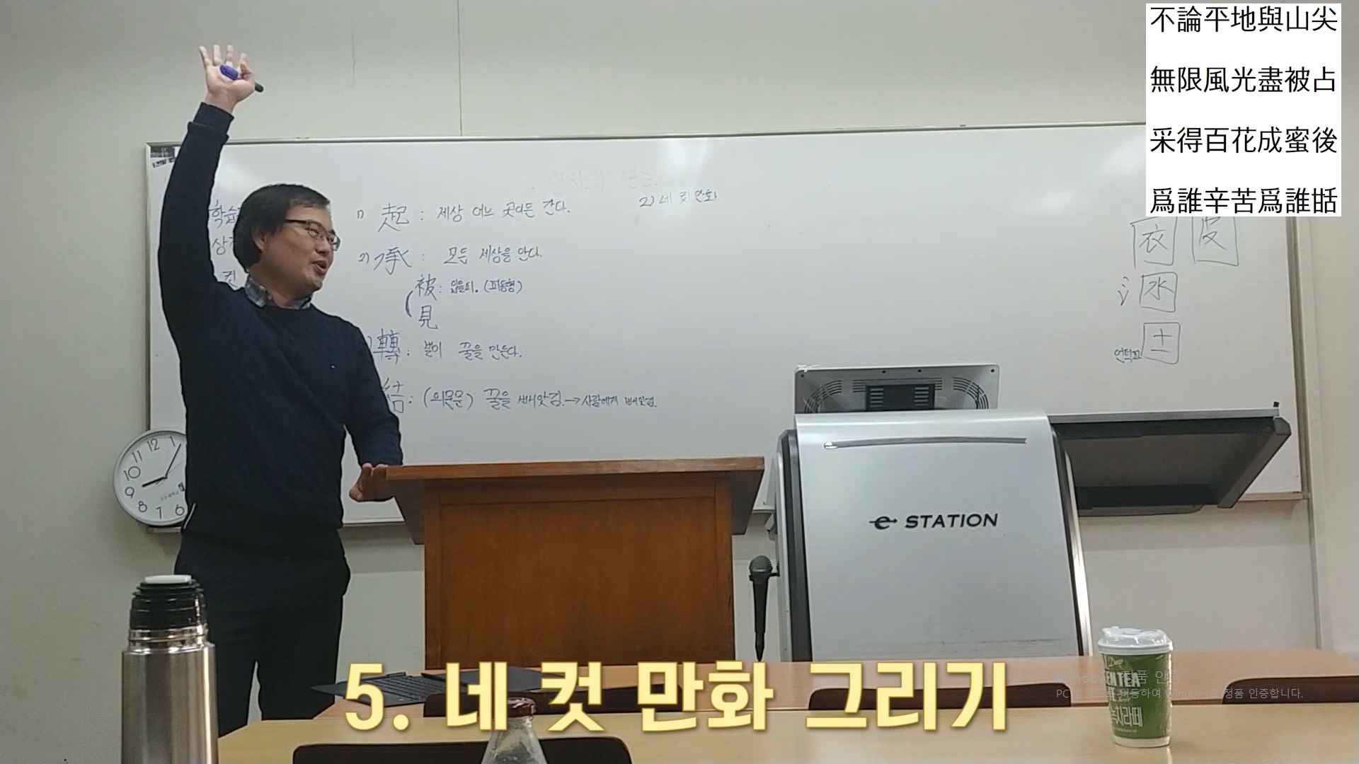 ‘不論平地與山尖이오’ 한 번 같이 해봅시다. 불론평지여산첨(不論平地與山尖)이오 무한풍광진피점(無限風光盡被占)이라 다시 한 번 無限風光盡被占이라 채득백화성밀후(采得百花成蜜後)오 다시 采得百花成蜜後오 위수신고위수첨(爲誰辛苦爲誰甛)이라 다시 爲誰辛苦爲誰甛이라