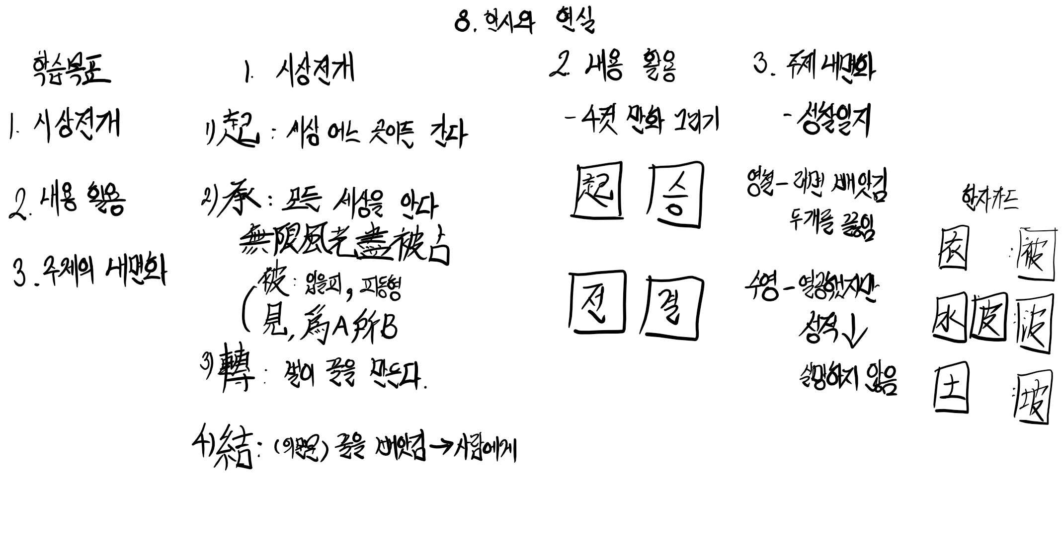 그래서 첫 번째 살펴볼 주제는, 학습목표는 첫 번째 시상전개를 통해서, 이 한시가 도대체 어떤 내용을 담고 있는지, 하나하나씩 알아보도록 하겠습니다.