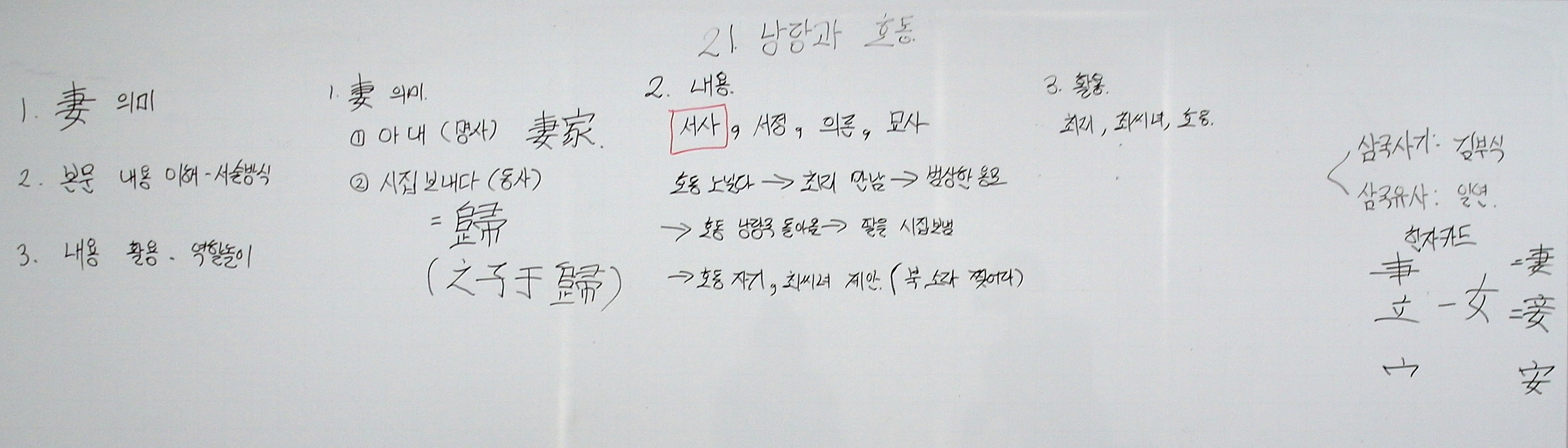 그래서 첫 번째 오늘의 학습목표로 들어가 보면(역시나 ‘학습목표’라는 판서를 빠뜨렸다. 2번째 수업인 토론의 자세를 할 때 외엔 첫 번째 삼인성호, 세 번째 수형시, 네 번째 벌, 어제까지 네 번이나 빠뜨렸다) 여기에 나오는 글자 중에 ‘妻’자라는 글자가 나오는데 이 妻에 대한 의미가 무엇 무엇이 있는지 좀 더 깊이 있게 알아보도록 하겠습니다.