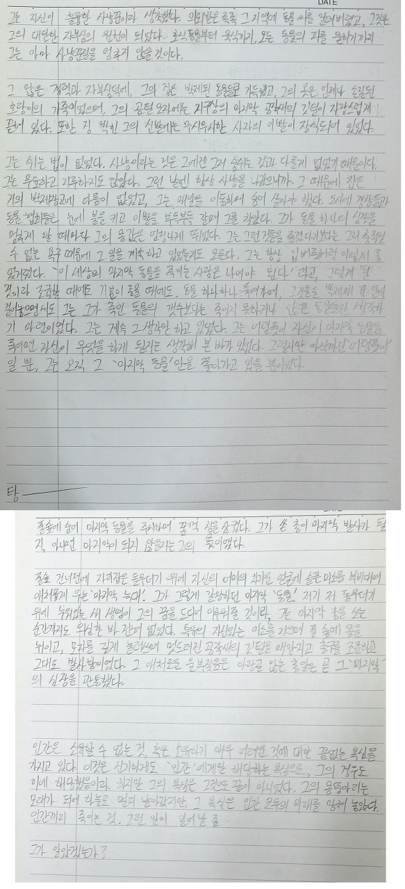그는 쉬는 법이 없었다. 사냥이라는 것은 그에겐 그저 숨쉬는 것과 다를 게 없었기 때문이다. 그는 무료하고 지루하지도 않았다. 그런 날엔 항상 사냥을 나갔으니까. 그 때문에 집은 거의 박제창고에 다름이 없었고, 그는 매일 이동하며 숨어 살아야 했다. 도시에 경찰들과 동물 협회들은 눈에 불을 켜고 이빨을 부득부득 갈며 그를 찾았다. 그가 동물 하나의 심장을 멈추게 할 때마다 그의 몸값은 엄청나게 뛰었다. 그는 그런 것들을 즐겼다기보다는 그저 충족될 수 없는 욕구 때문에 그 일을 계속하고 있었는지도 모른다. 그는 항상 입버릇처럼 이렇게 중얼거렸다. ‘이 세상의 마지막 동물을 죽이는 사람은 나여야 된다.’라고. 그렇게 될 것이라 조급할 때에도 기분이 좋을 때에도 동물 하나 하나 죽여가며 그것들을 박제해 집 안에 걸어놓으면서도 그는 그가 죽인 동물의 개수보다는 죽이지 못한 동물들만 생각하기 마련이었다. 그는 계속 그 생각만 하고 있었다. 그는 어렴풋이 자신이 마지막 동물을 죽이면 자신이 무엇을 하게 될지는 생각해 본 바가 있었다. 그렇지만 아직까진 ‘어렴풋이’ 일 뿐, 그는 오직 그 ‘마지막 동물’만을 쫓아가고 있을 뿐이었다.
