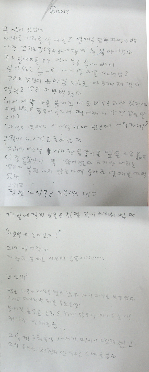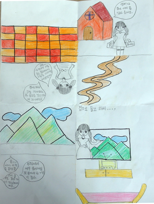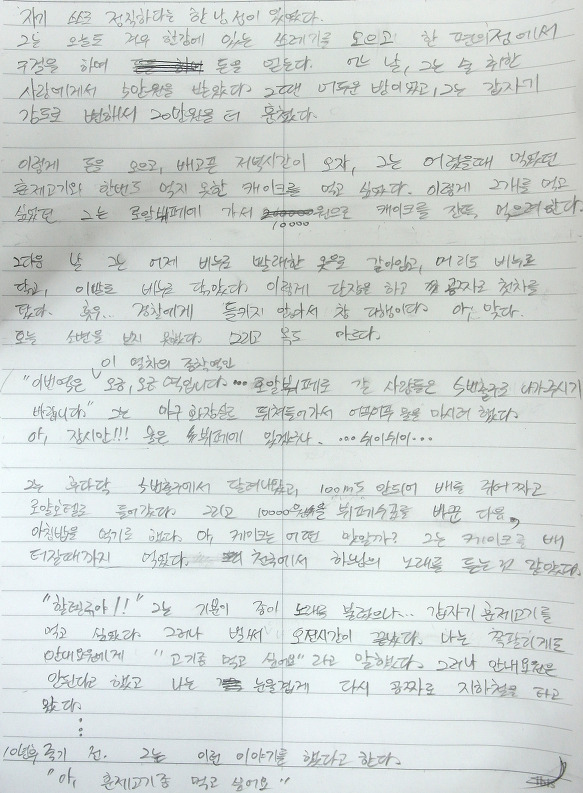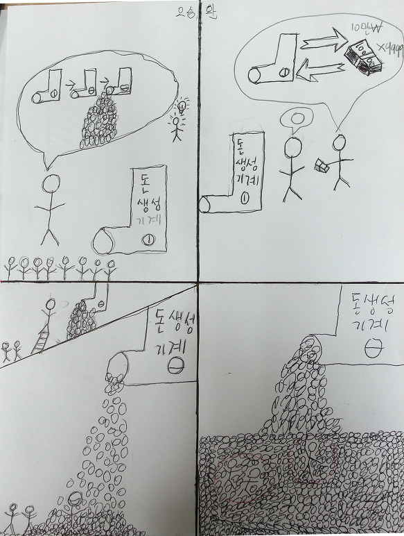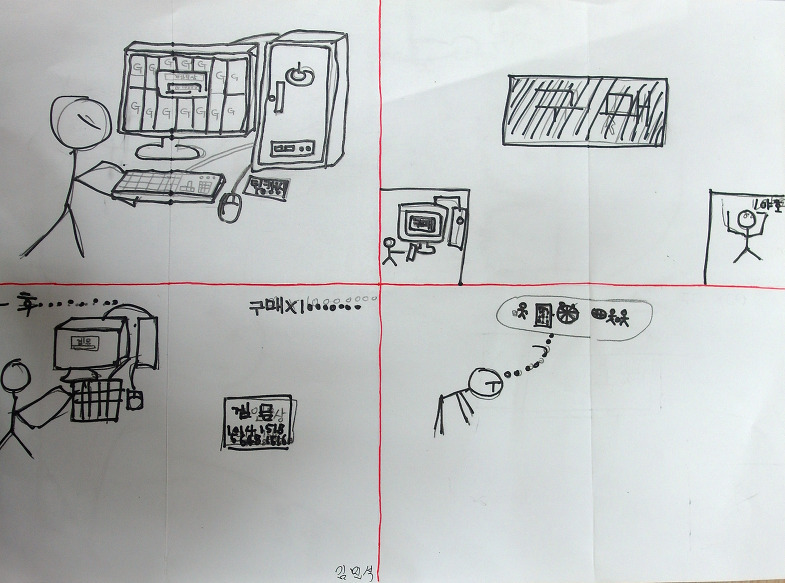 “엄마, 아빠 저 왔습니다.” 다행히 집에는 아무도 없는지 쥐 죽은 듯 조용했습니다. 일단, 자판기를 2층 계단을 통해 조심조심 들고 내 방에 놓자, 이제야 땀과 함께 마음이 편안해졌습니다. 이제 맘 놓고, 먹고 싶을 때 마트에 가지 않아도 자판기 안에는(음료수, 약, 과자, 치약, 칫솔, 사탕, 인형, 문구용품 등) 다양한 것들이 다 있어서 나한테는 정말 편안하고 좋았습니다.