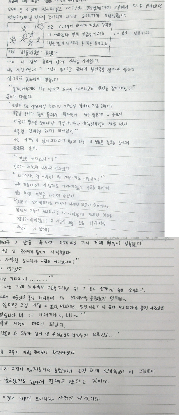 나는 건호에게 사실대로 이야기했고 건호는 나에게 믿을 만한 정보를 가르쳐 주었다. “최근에 단재학교라는 예전에 사라진 학교에 단군이라는 방에서 그들이 모나리자를 15000만불에 거래할 거라는 정보가 들어왔네. 그 시간이 오늘 오후 11시야! 빨리 가 보게!”