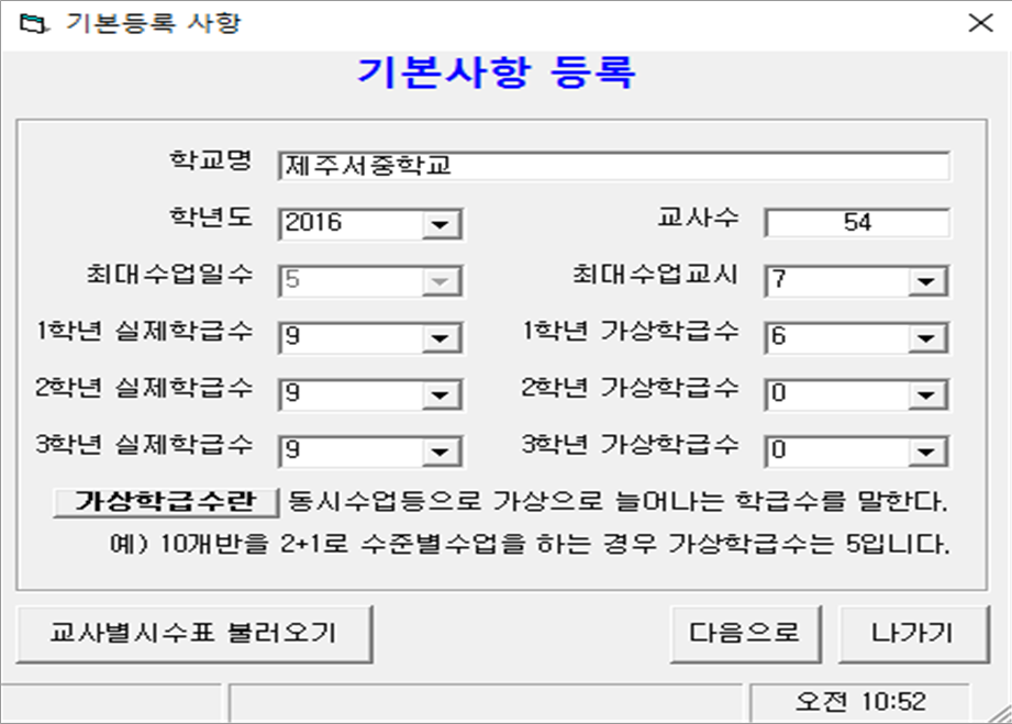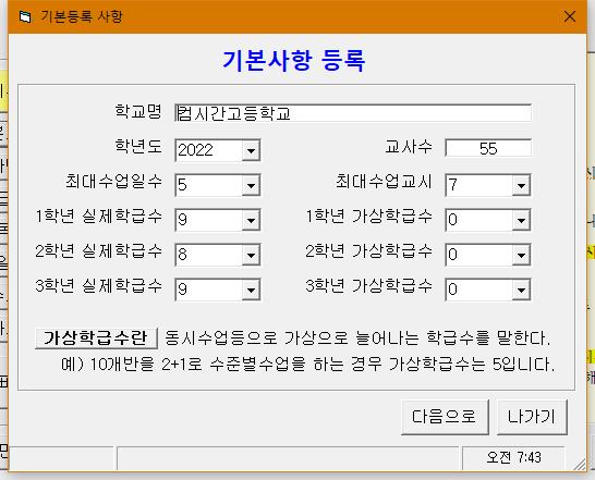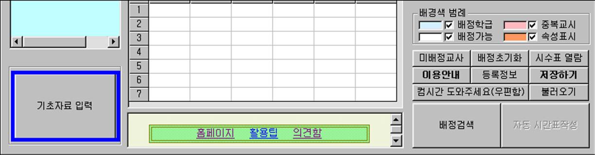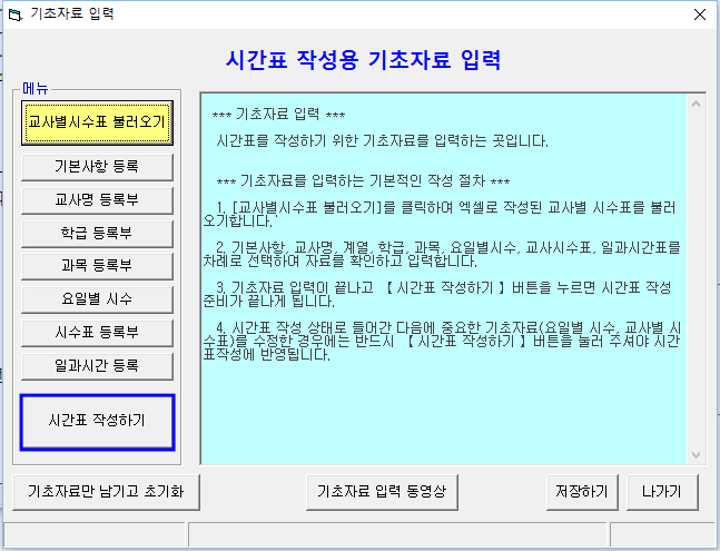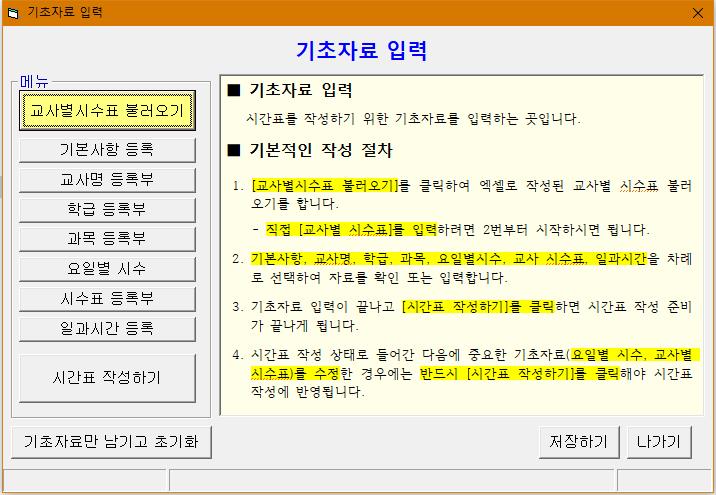 (3) 파일명이 만들어지면 먼저 시간표를 작성하기 위해 [기초자료 입력]버튼을 눌러 기초자료 화면으로 들어간다.