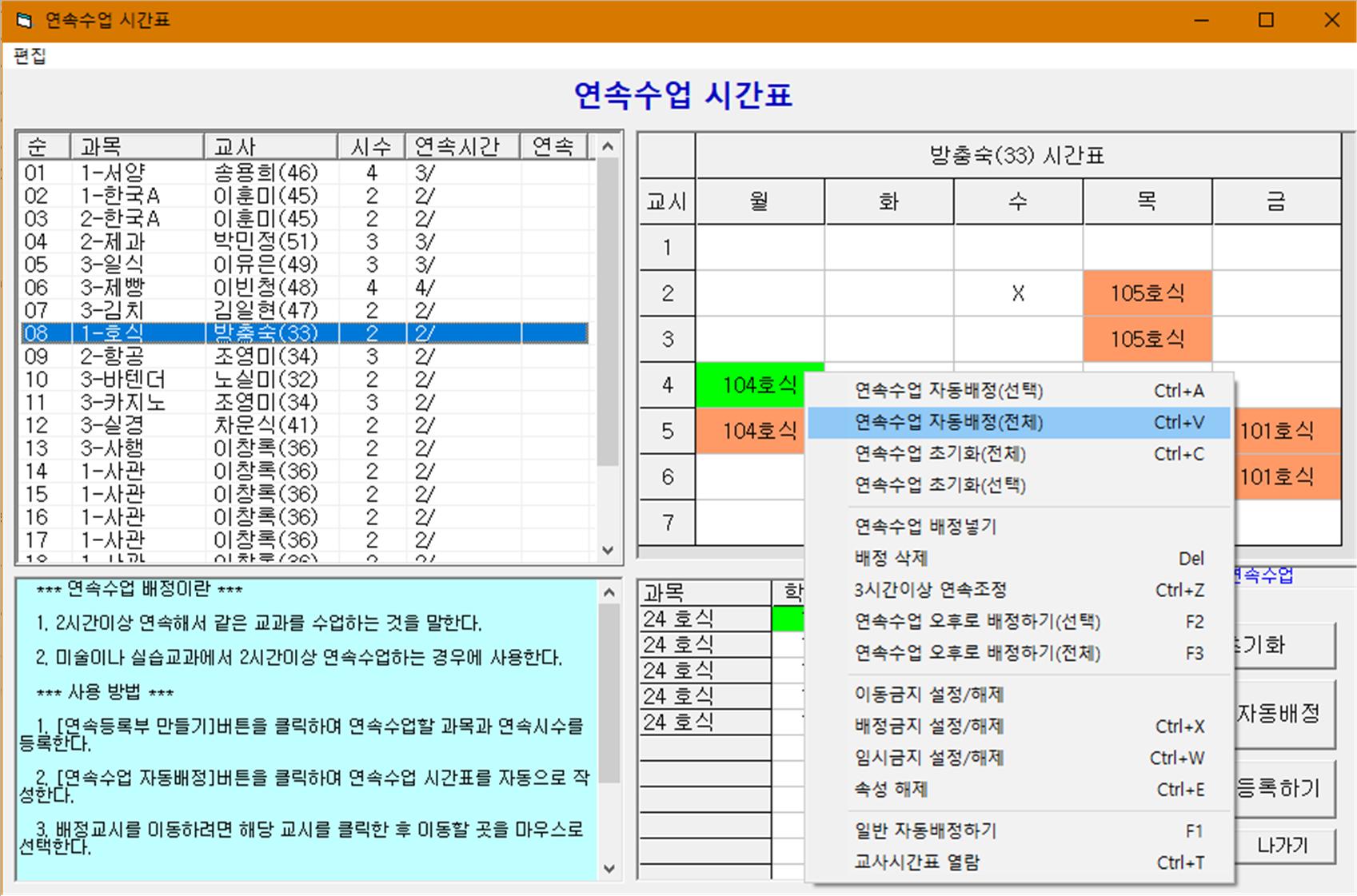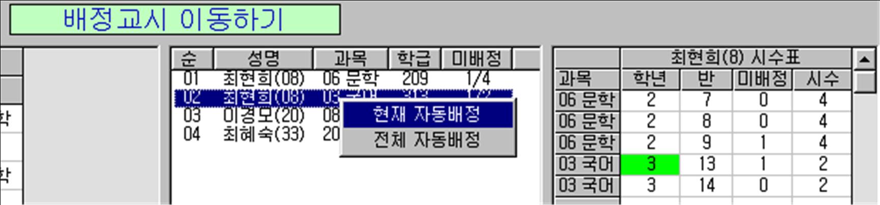 (11) [자동 시간표작성] 또는 [배정검색]을 클릭하여 시간표를 작성합니다.