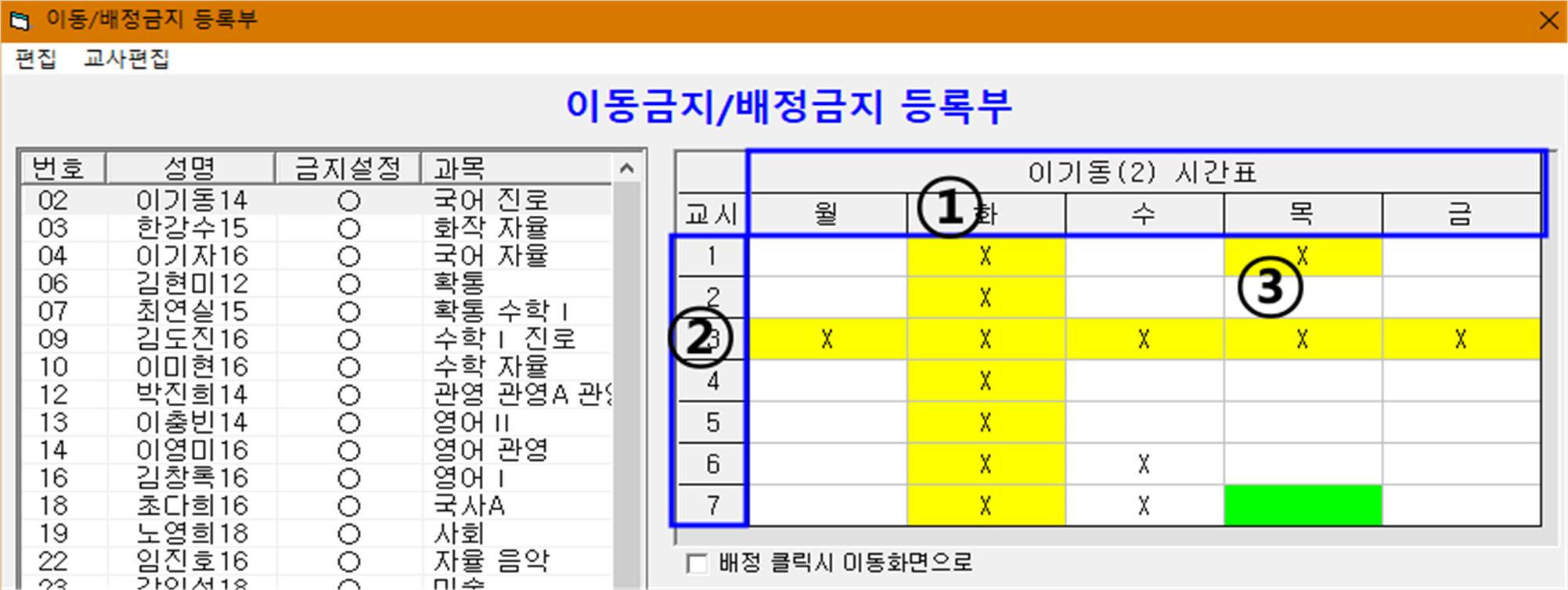 ▶특별교사 배정 : 이동금지나 배정금지 교시를 설정합니다.