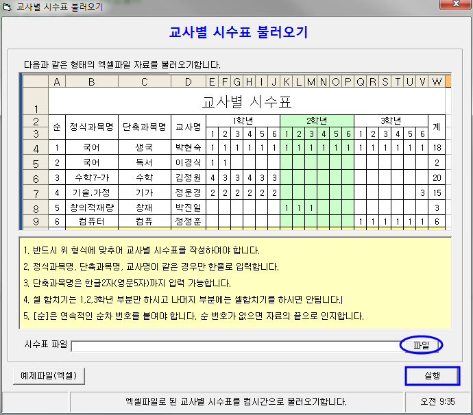 5. 준비한 교사별 시수표 엑셀 파일을 선택한 후 [실행]을 클릭하면 시간표를 작성하기 위한 기초자료 입력이 이루어지게 됩니다.
