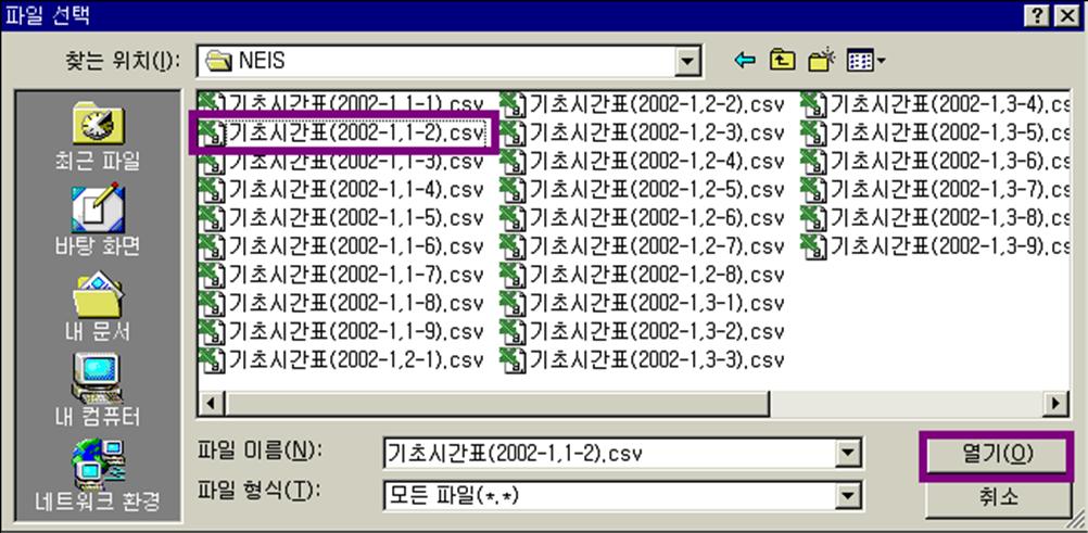 (9) NEIS용 일괄파일이 있는 폴더로 가서 입력할 학급 시간표를 선택하고 열기를 누른다.