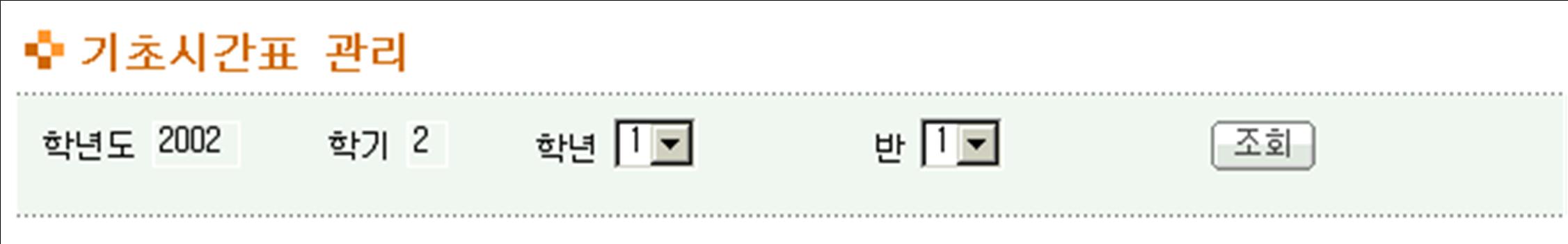 ① [교육과정-시간표관리-기초시간표관리]에서 ‘학년도’, ‘학기’를 확인하고 ‘학년’ 선택 후 조회