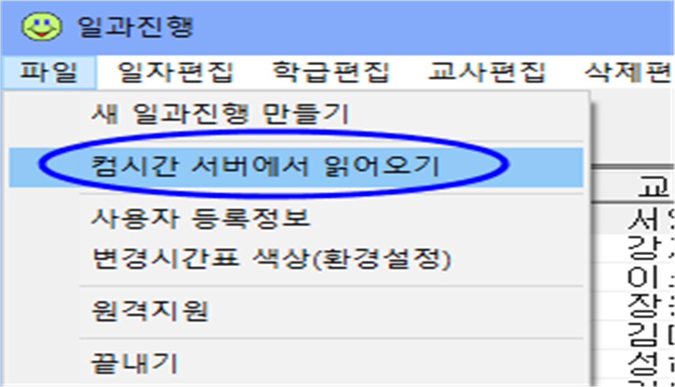 5. 재택근무가 끝나고 학교에서 일과진행을 사용할 때는 반드시 [파일]-[컴시간서버에서 읽어오기]를 선택한 후 일과진행을 사용하시기 바랍니다.