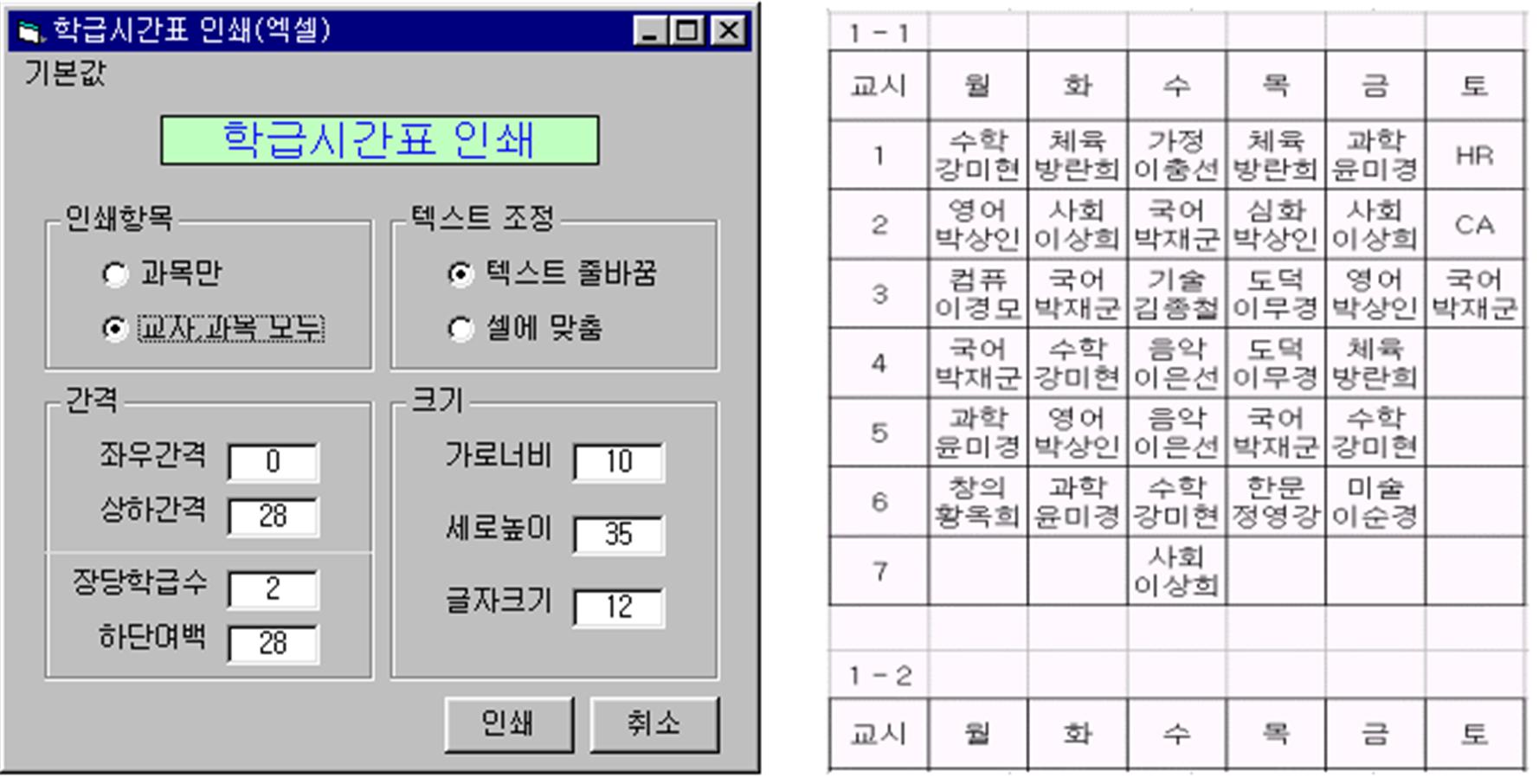 (나) 상하간격 : 1-1 학급시간표와 1-2 학급시간표 사이의 간격