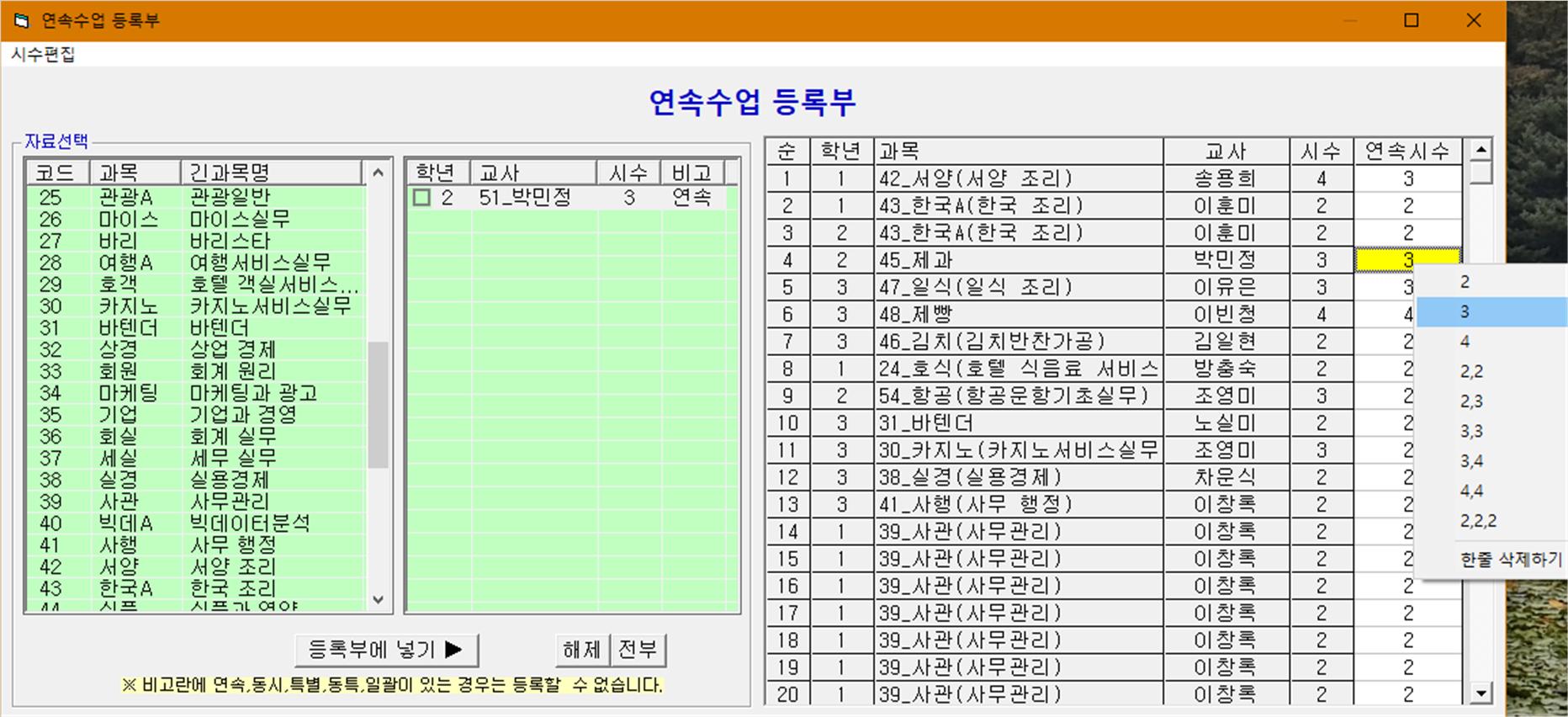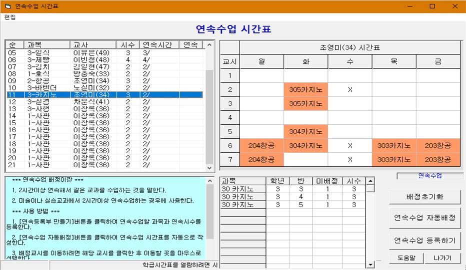 ▶ 연속수업 배정 : 2시간이상 연속해서 같은 교과를 수업하는 것을 배정합니다.