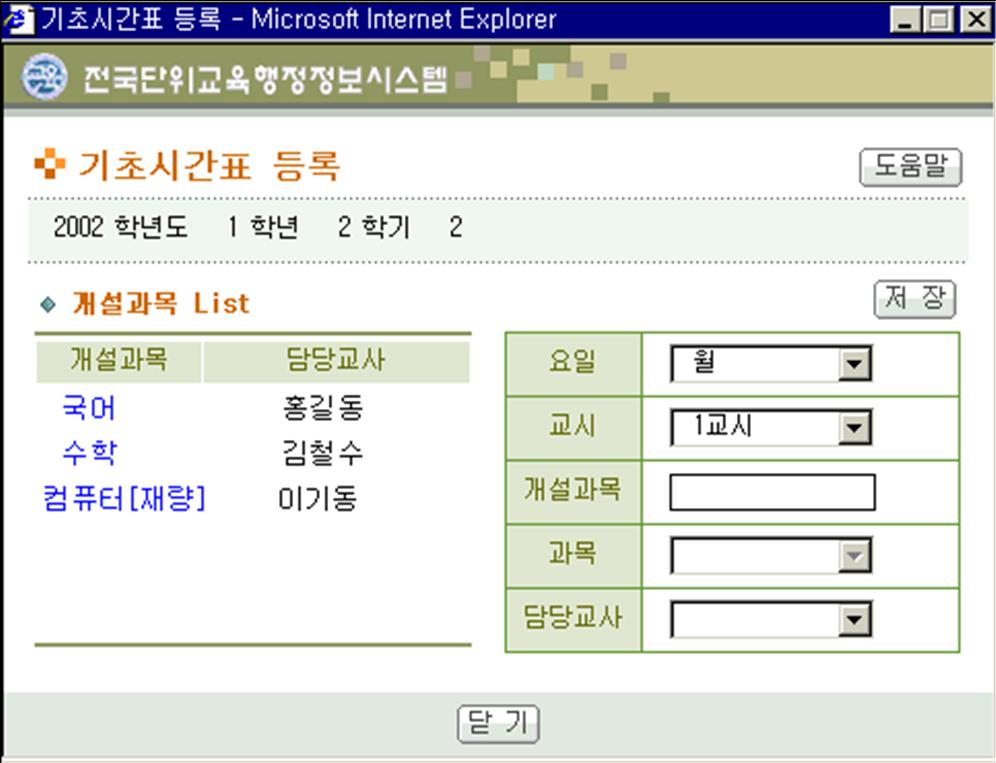 (4) 다음화면이 개별적으로 하나씩 기초시간표를 입력하는 화면입니다.