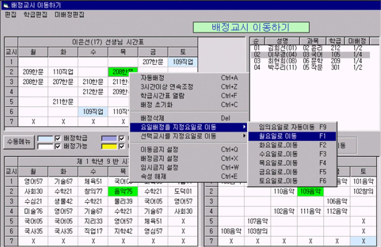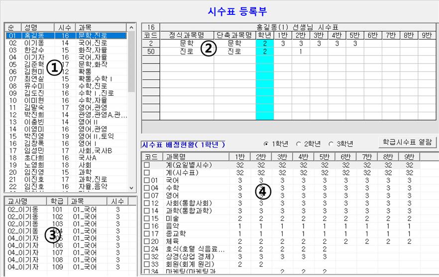 8. 교사별 시수표 불러오기를 통하여 교사 등록부, 학급 등록부, 과목 등록부, 시수표 등록부등의 입력이 끝나게 됩니다. 다음으로 각 메뉴들을 선택하여 입력이 잘되었는지 확인합니다.