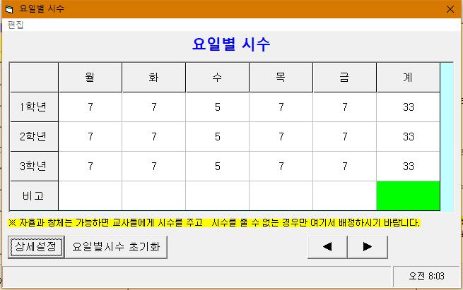 - 이전방식으로 요일별시수를 설정하려면 [상세설정]을 클릭하세요.