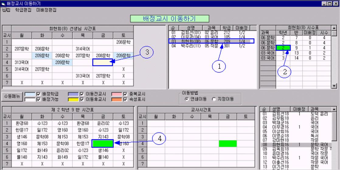 (8) 교사별 시수표 불러오기를 통하여 교사 등록부, 학급 등록부, 과목 등록부, 시수표 등록부등의 입력이 끝나게 됩니다. 다음으로 각 메뉴들을 선택하여 입력이 잘되었는지 확인합니다.
