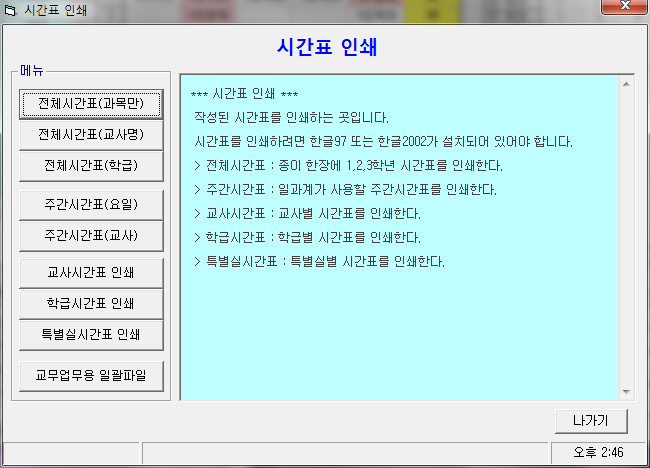 13. [인쇄] 메뉴를 선택하여 시간표를 인쇄합니다.