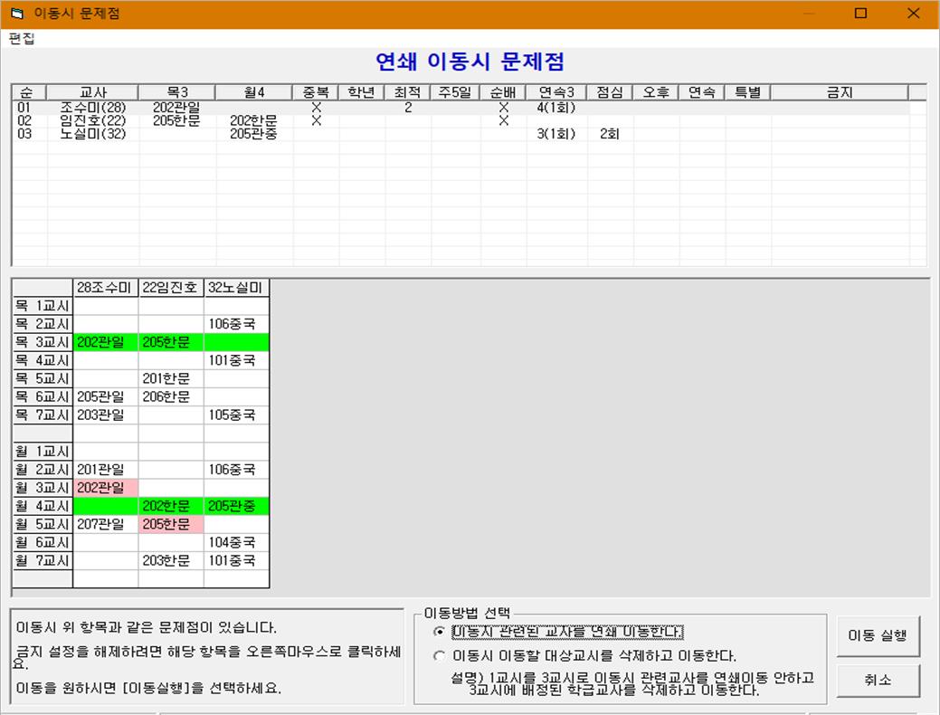 (나) 기초자료 입력이 끝나고 시간표작성하기로 넘어온 경우에는 학급과 교사에 값을 가지게 됩니다.