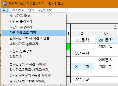 (1) 새 시간표를 작성하려면 [파일]-[새 시간표 작성]를 선택한다.