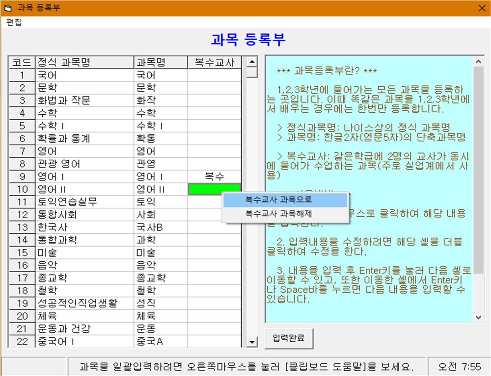 (1) 일괄파일에 들어있는 과목명이 NEIS에 등록이 안되어 있는 경우