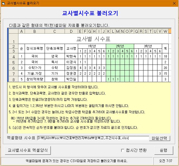 (5) 준비한 교사별 시수표 엑셀 파일을 선택한 후 [실행]을 클릭하면 시간표를 작성하기 위한 기초자료 입력이 이루어지게 됩니다.