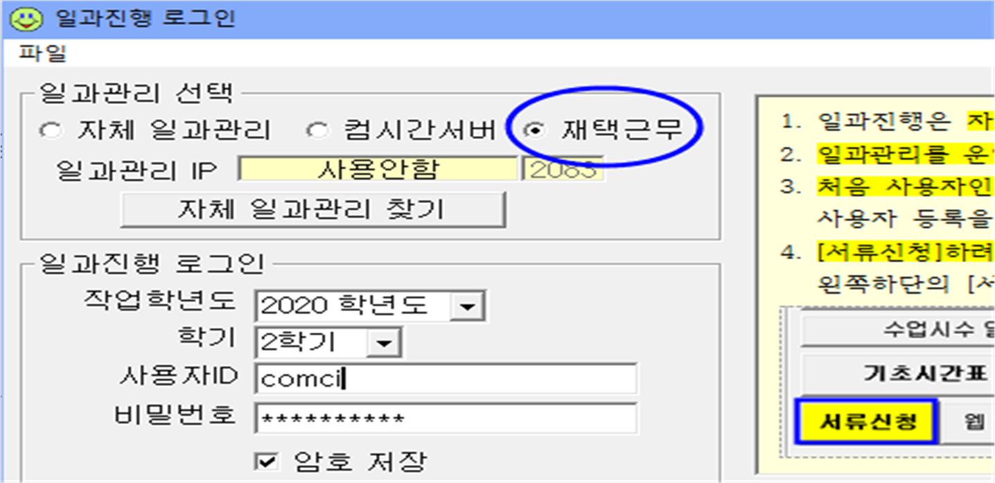 2. [재택근무]로 로그인하면 컴시간 서버에 저장된 시간표자료를 자동으로 가져와 일과진행을 사용할 수 있도록 일과진행이 구성됩니다.