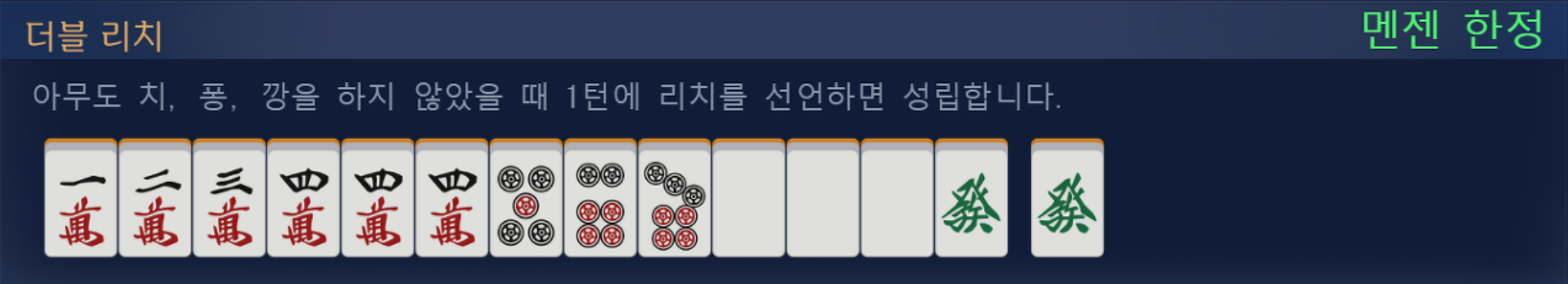 더블 리치(ダブル立直): 누구도 울지 않았는데 1턴에 리치를 선언할 때 성립.