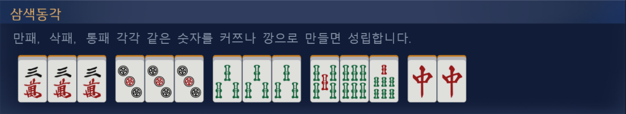 삼색동각(三色同刻): 세 개의 패(만ㆍ삭ㆍ통)로 같은 숫자를 커쯔나 깡으로 만들 때 성립.