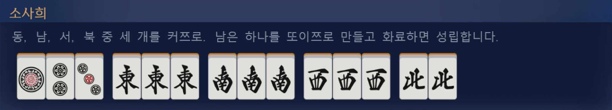 소사희(小四喜): 방위패 세 개를 커쯔로, 하나는 또이쯔로 만들면 성립.