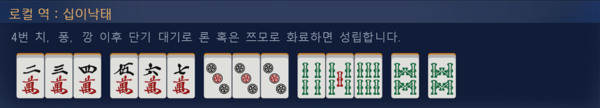 | 텐파이(聽牌) | 하나의 패만 들어오면 승리하게 되는 경우 |