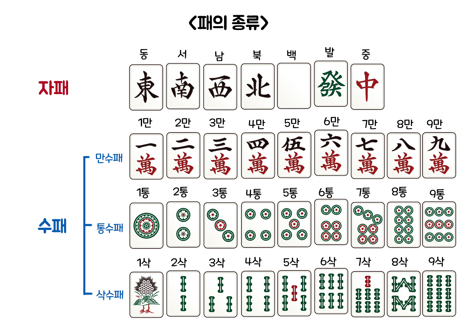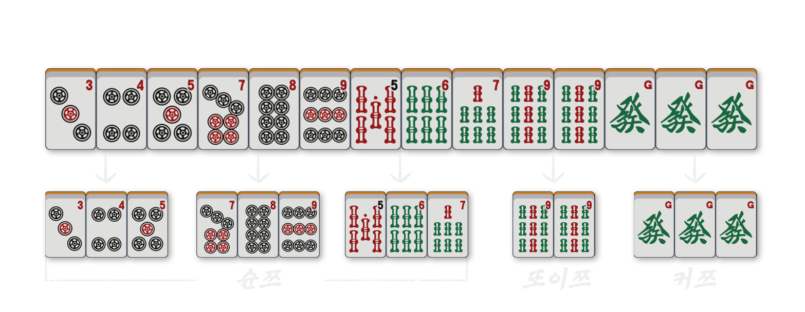 | 머리 | 같은 숫자나 자패로 2개 구성(‘커쯔刻子’라고 함) |
