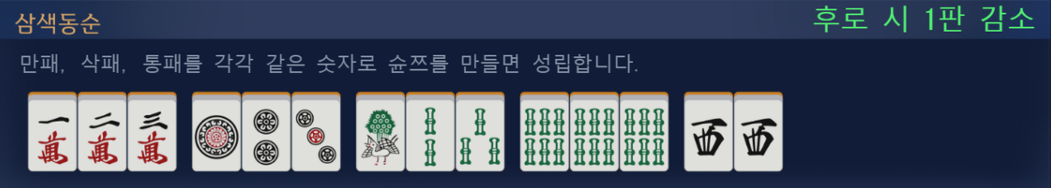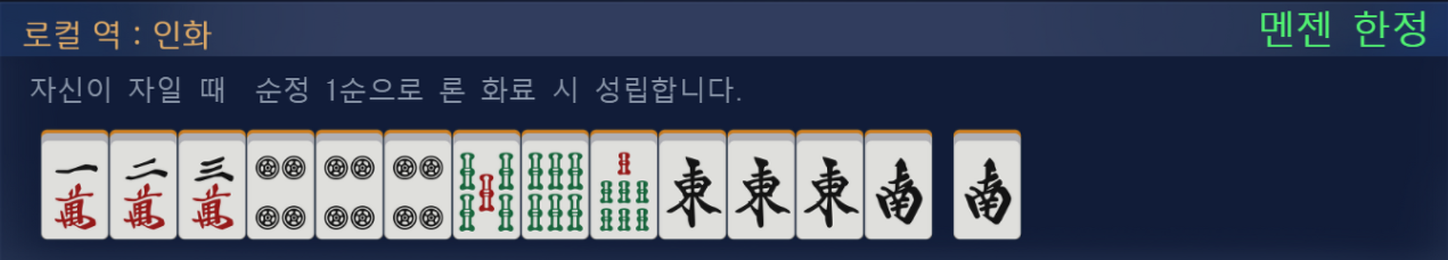 | 멘젠(門前) | 남의 패를 가져오지 않고(울지 않고) 13개의 패를 구성한 경우 |
