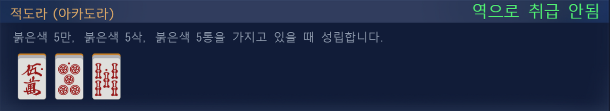 적도라(아카도라, 赤ドラ): 붉은색 5만ㆍ5삭ㆍ5통을 가지고 있을 때 성립.