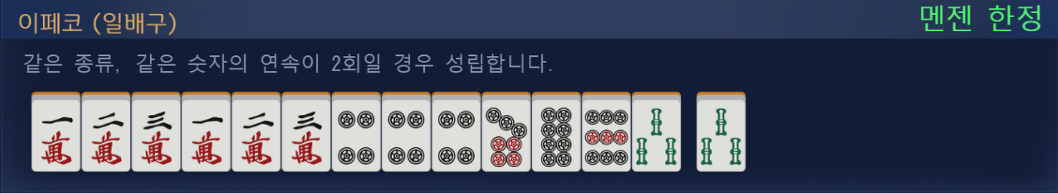 일배구(이페코, 一盃口): 같은 종류나 같은 숫자의 연속이 2회일 경우 성립.