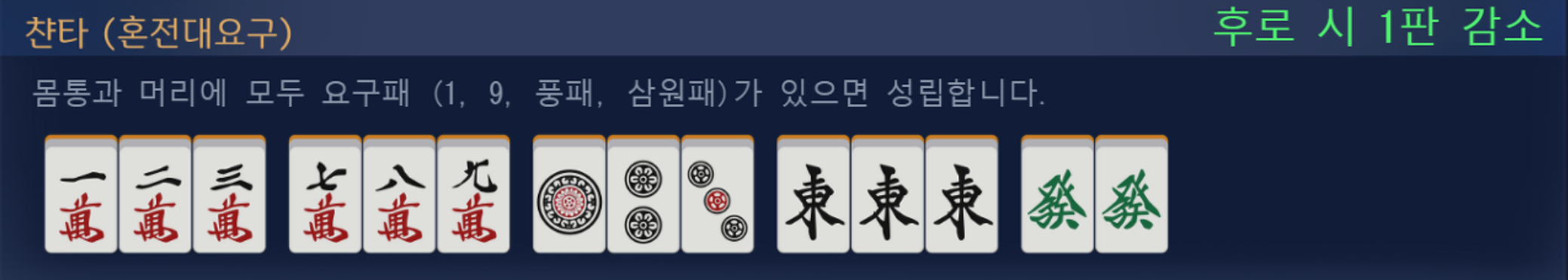혼전대요구(챤타, 混全帯幺九): 머리와 몸통에 요구패(1ㆍ9ㆍ풍패ㆍ삼원패)가 있으면 성립.