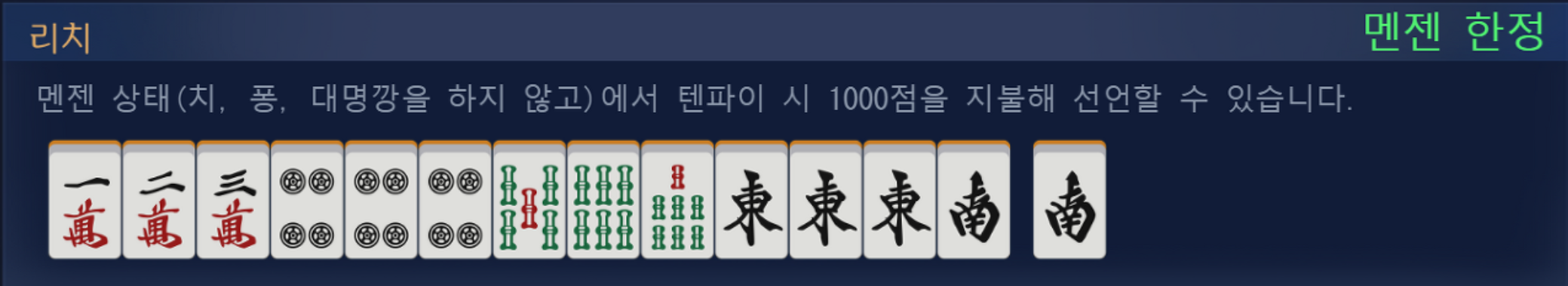 리치(立直): 멘젠 상태에서 텐파이 시 1000점을 지불해 선언할 수 있음.