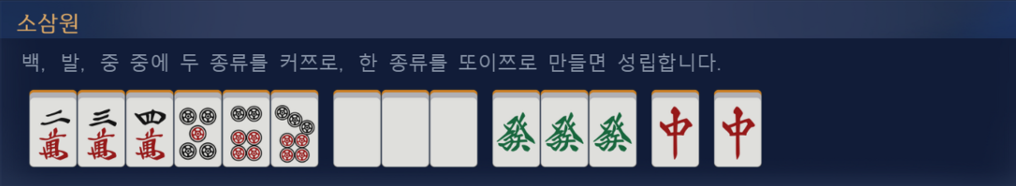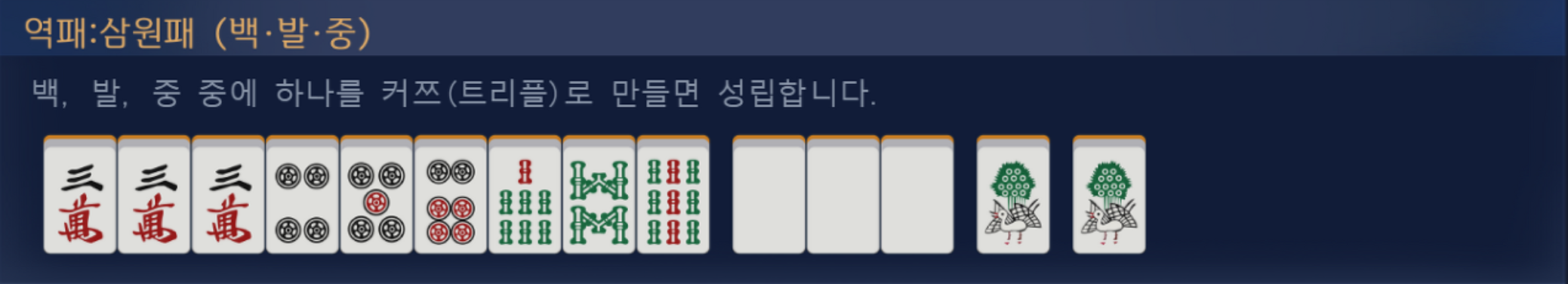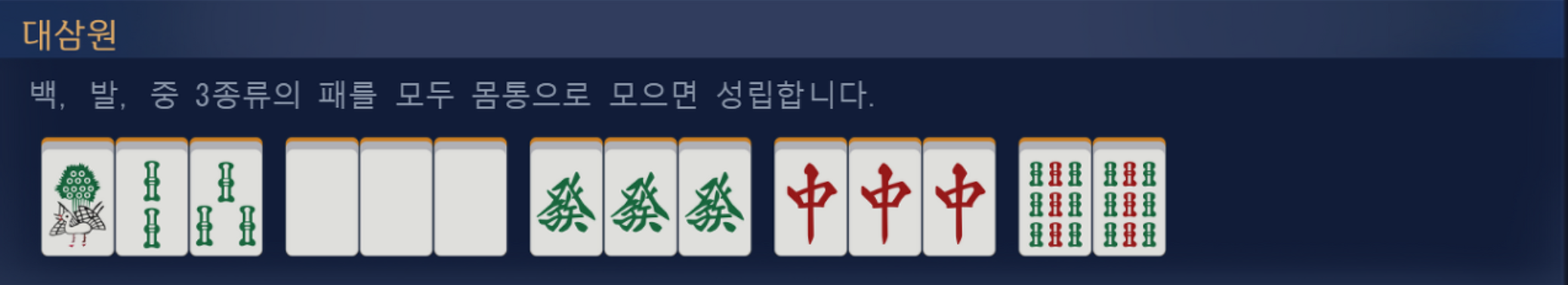 대삼원(大三元): 삼원패 3종류의 패를 모두 몸통으로 만들면 성립.