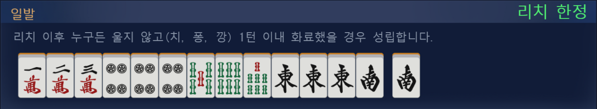 일발(一發): 리치 이후 누구든 울지 않고 1턴 이내에 화료했을 때 성립.
