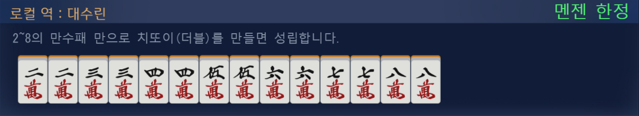 로컬 역 대수린(大數隣): 2~8 만수패로 치또이를 만들면 성립.