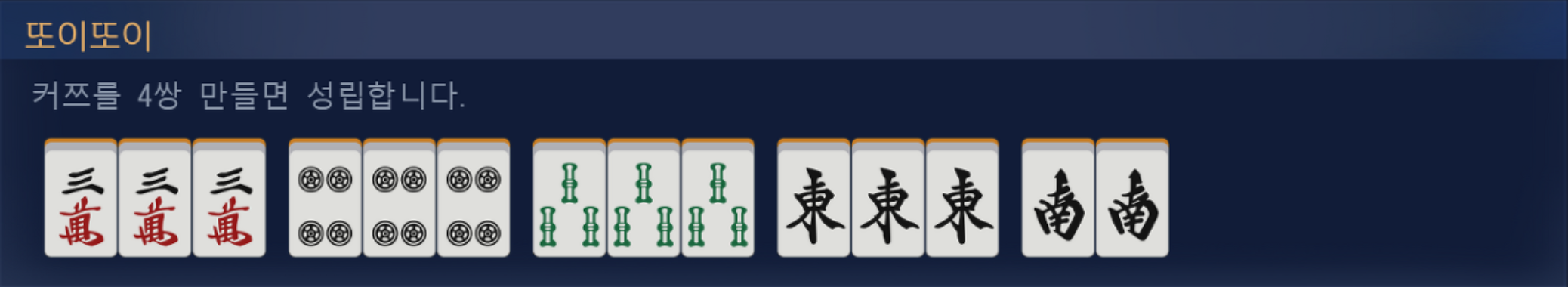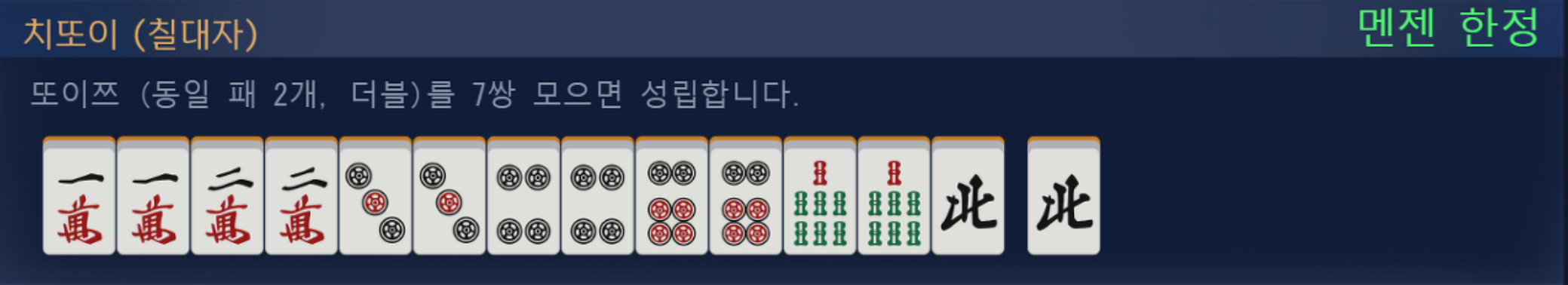 칠대자(치또이, 七対子): 또이쯔를 7개 모으면 성립.