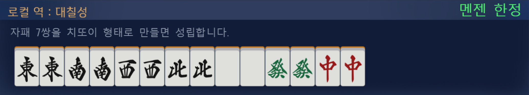 로컬 역 대칠성(大七星): 자패 7쌍을 치또이 형태로 만들면 성립.