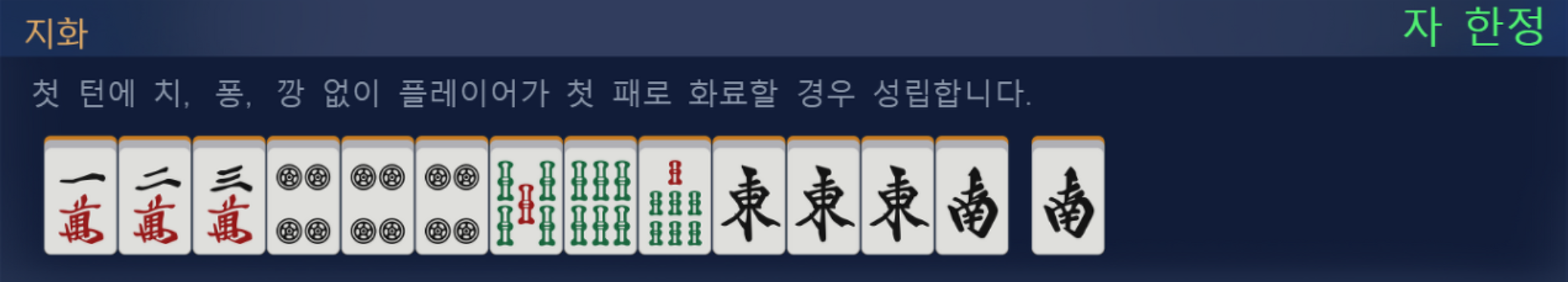 지화(地和): 첫 턴에 울지 않고 게임자가 첫 패로 화료할 때 성립.