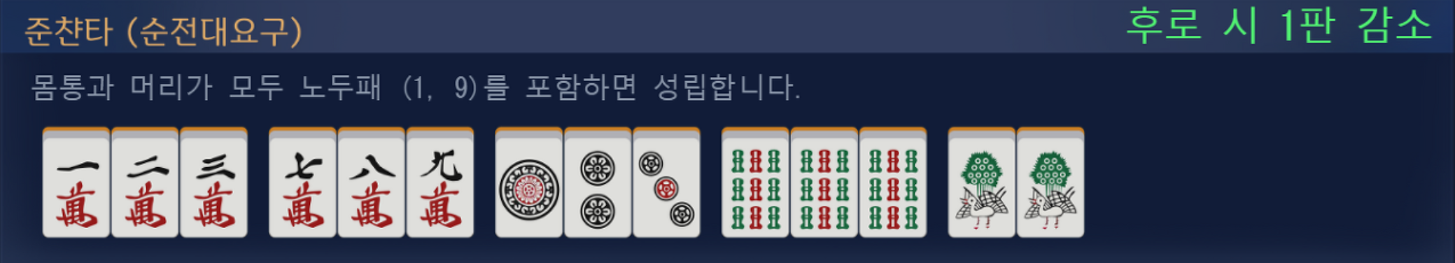순전대요구(준챤타, 純全帯幺九): 머리와 몸통에 모두 노두패(1ㆍ9)가 포함되면 성립.