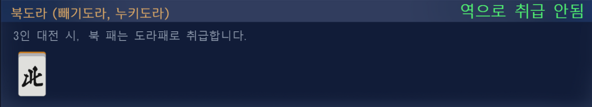 북도라(빼기도라, 누키도라, 北ドラ): 3인 게임에서 북 패는 도라패로 취급.