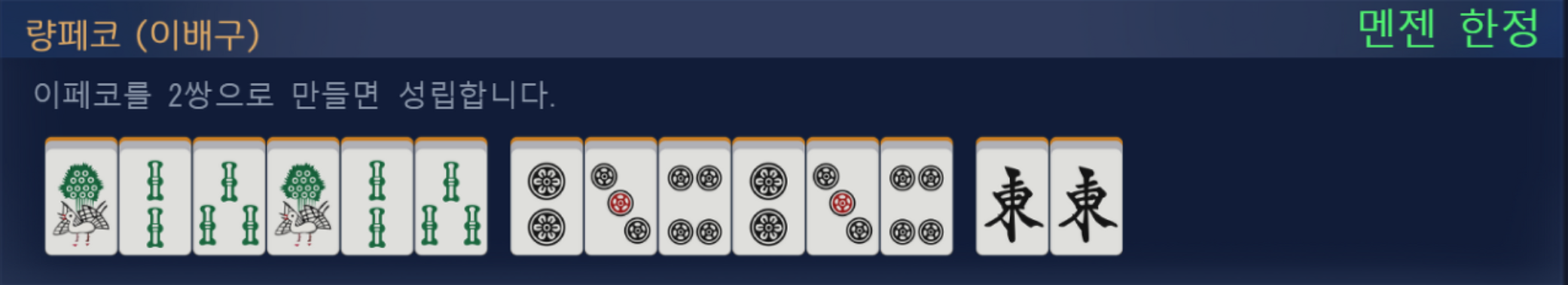 이배구(량페코, 二盃口): 이페코를 2쌍 만들면 성립.