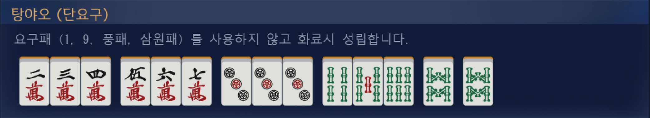 탕야오(단요구, 断么九): 요구패를 사용하지 않고 화료시 성립.